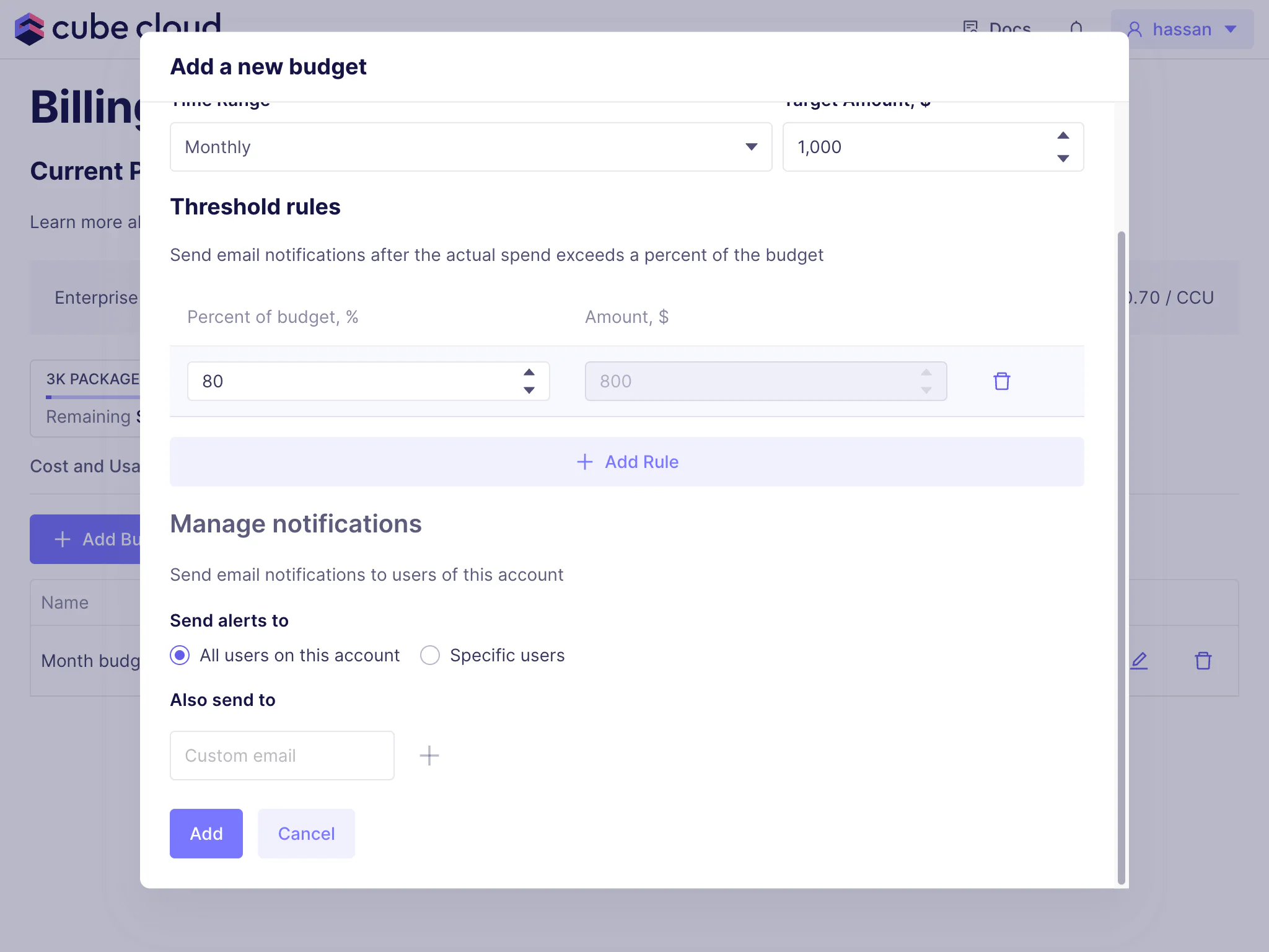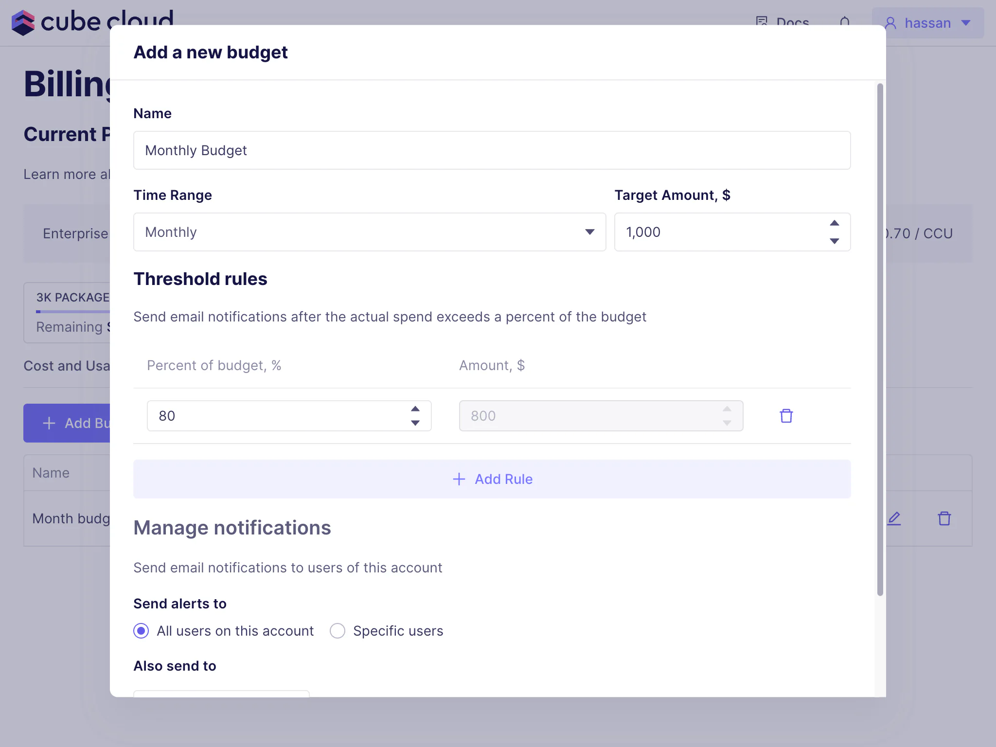 Budgets are configured on a per-account basis. When a budget is triggered, any configured users will receive an email notification. Budget notifications are sent immediately after being triggered.
