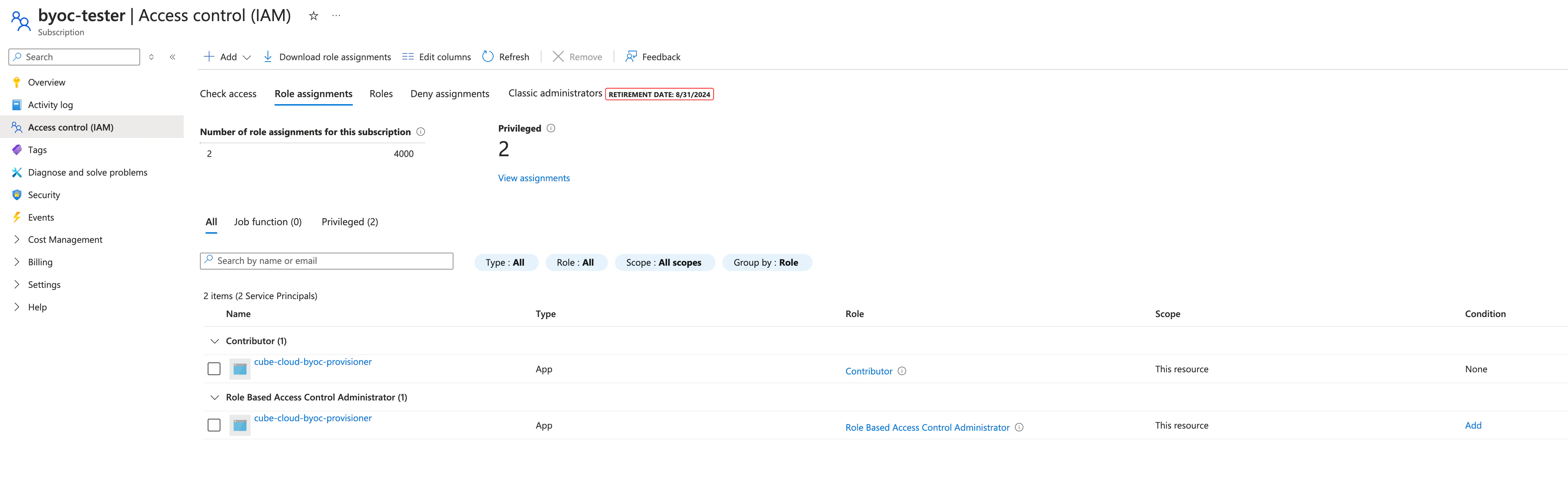 and assing Contributor and Role Based Access Control Administrator to the cube-cloud-byoc-provisioner