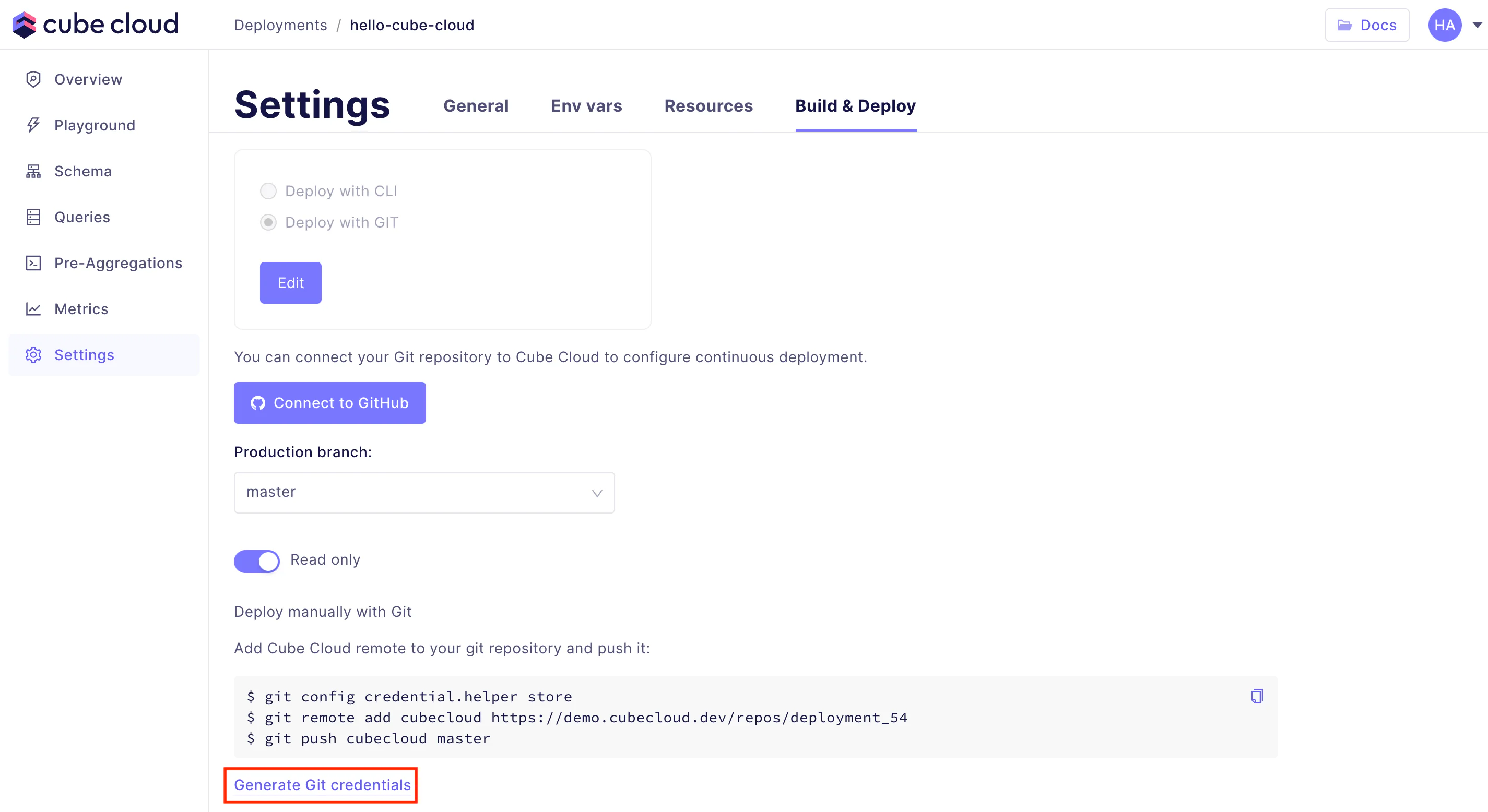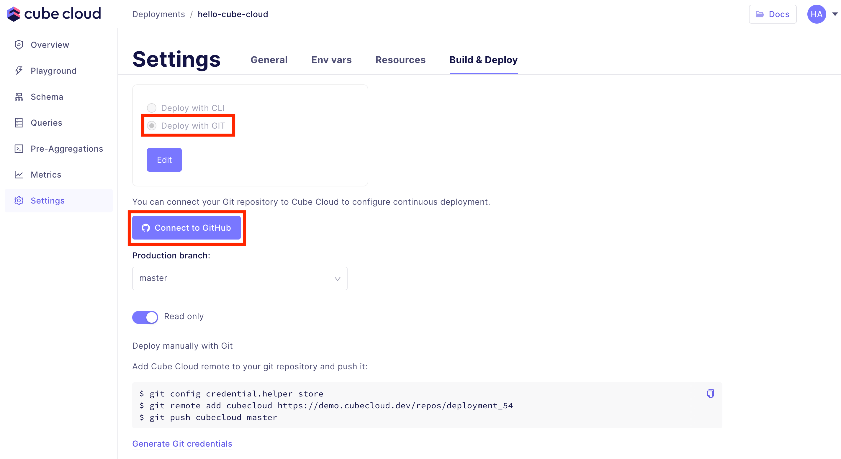 Cube Cloud will automatically deploy from the specified production branch (master by default).