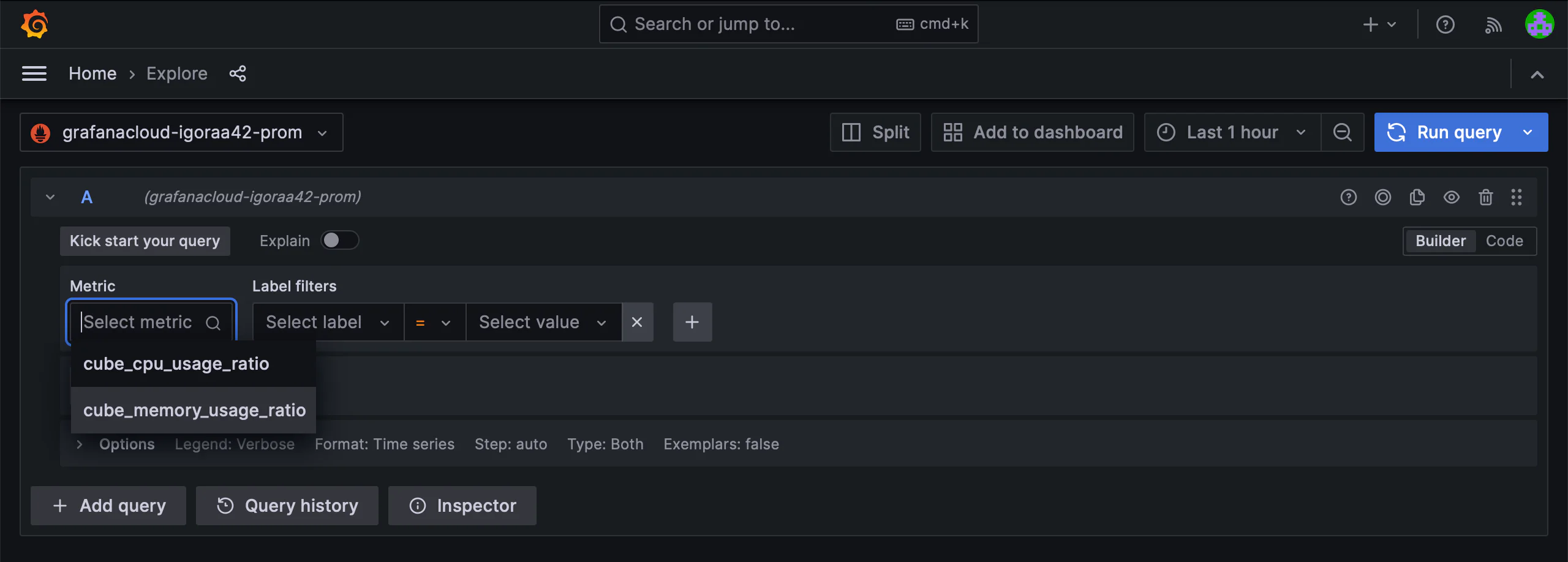 password = "eyJrIjoiYTg1OTQ2OGY4Yzg3MTQxODc5OTA4NDUxMGM4NTA2ZDQ3ZjliYWZjOCIsIm4iOiJwcnciLCJpZCI6ODc1NzE5fQ=="Commit the configuration for Vector, it should take effect in a minute. Then, navigate to in Grafana Cloud, select metrics from the drop down: