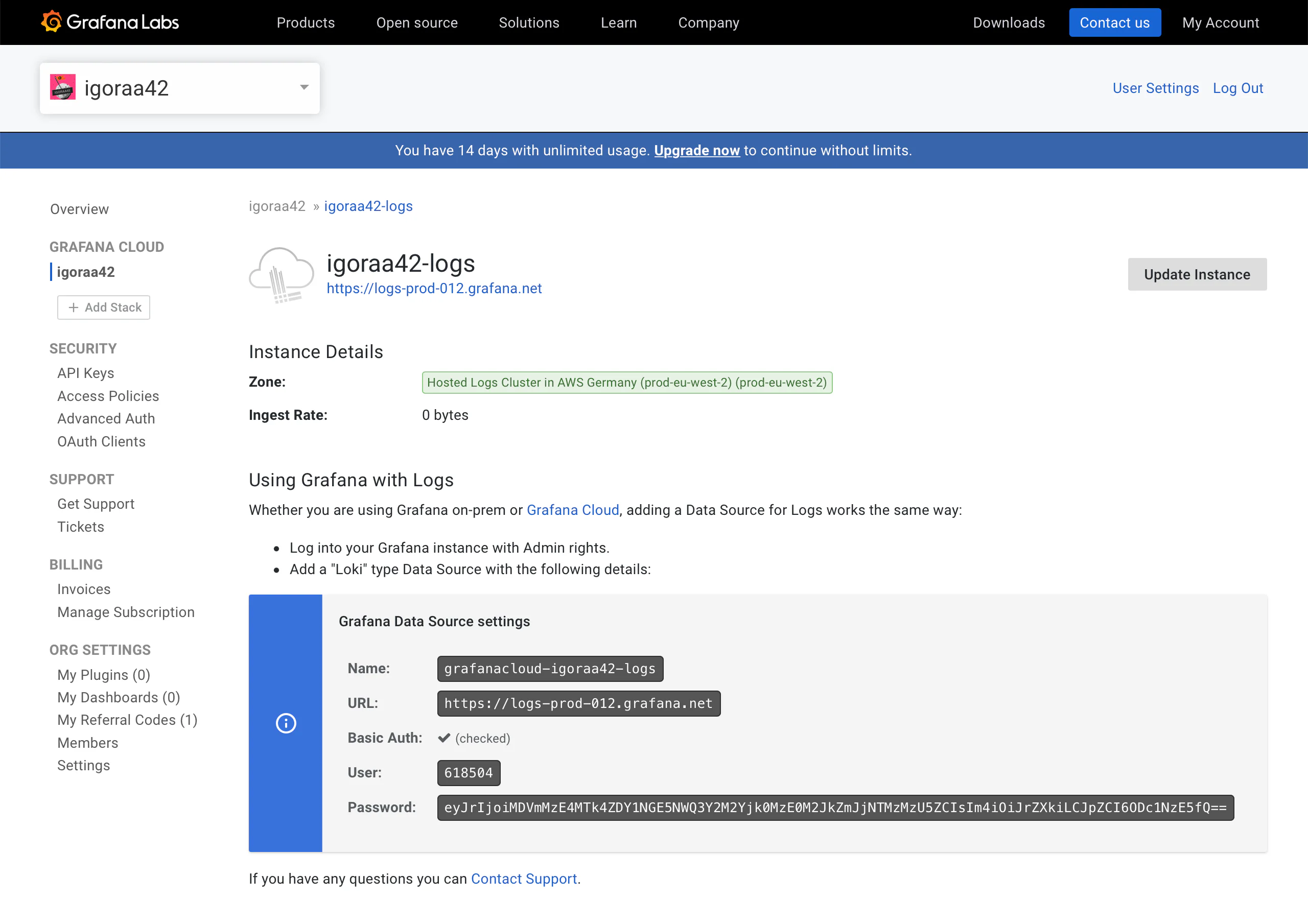 To export logs to Grafana Cloud, go to your account and get credentials for Loki, the logging service in Grafana Cloud: