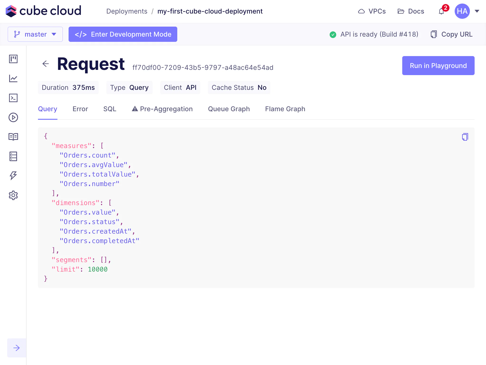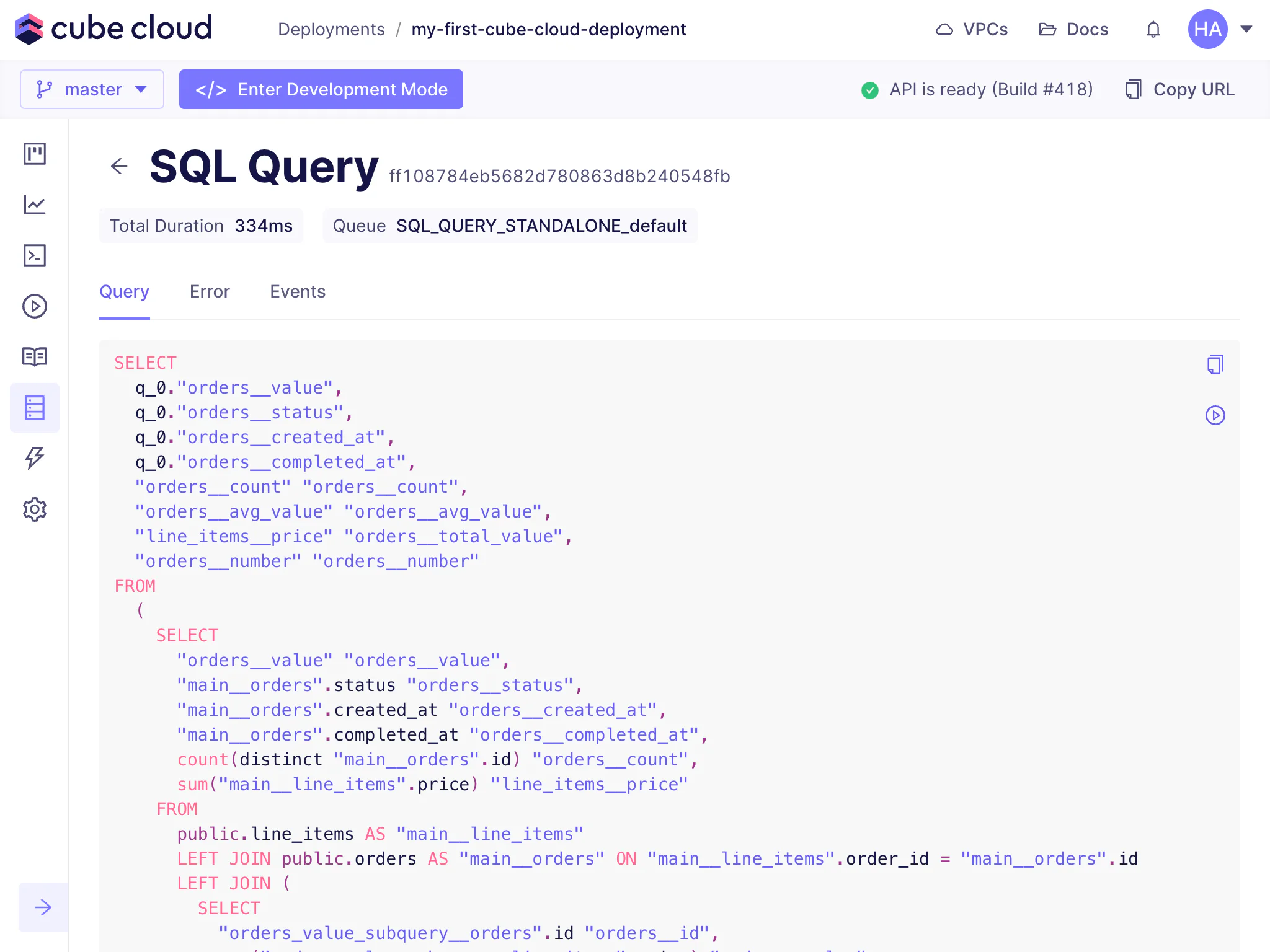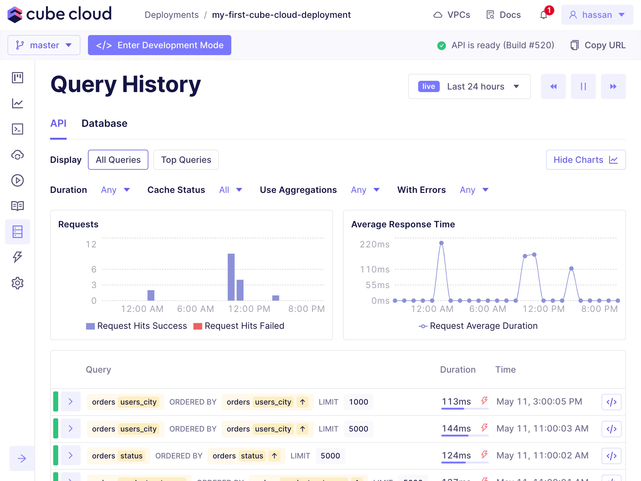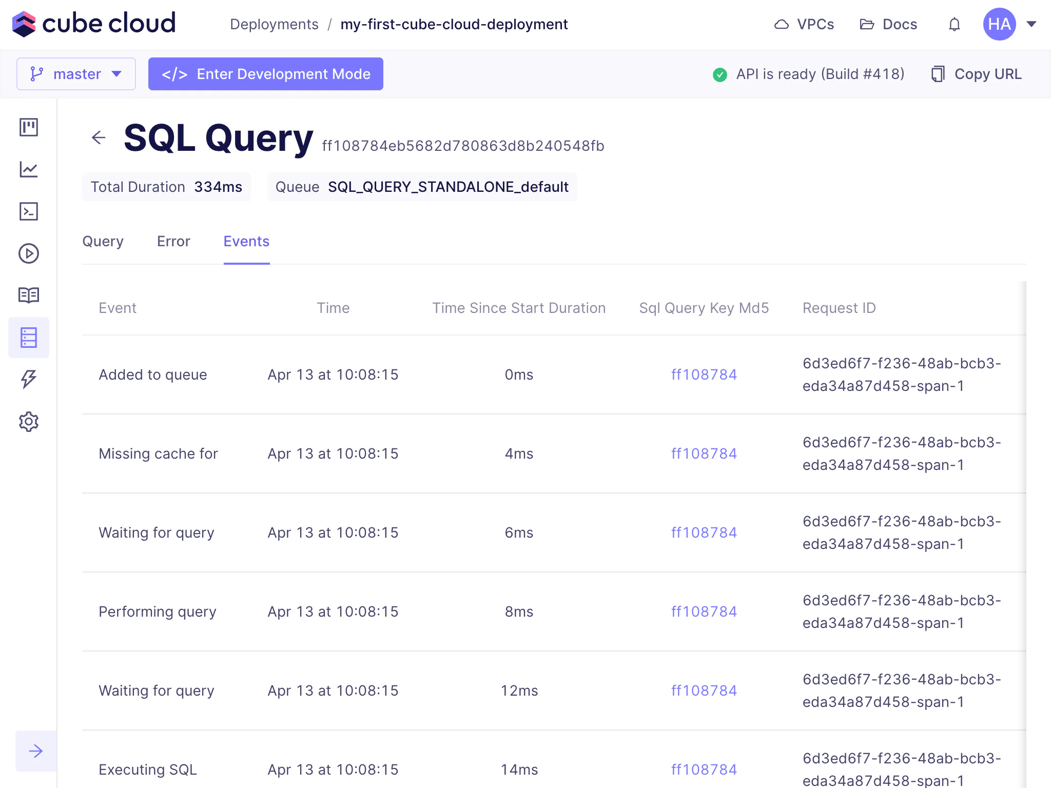 The Query History feature in Cube Cloud is a one-stop shop for all performance and diagnostic information about queries issued for a deployment.