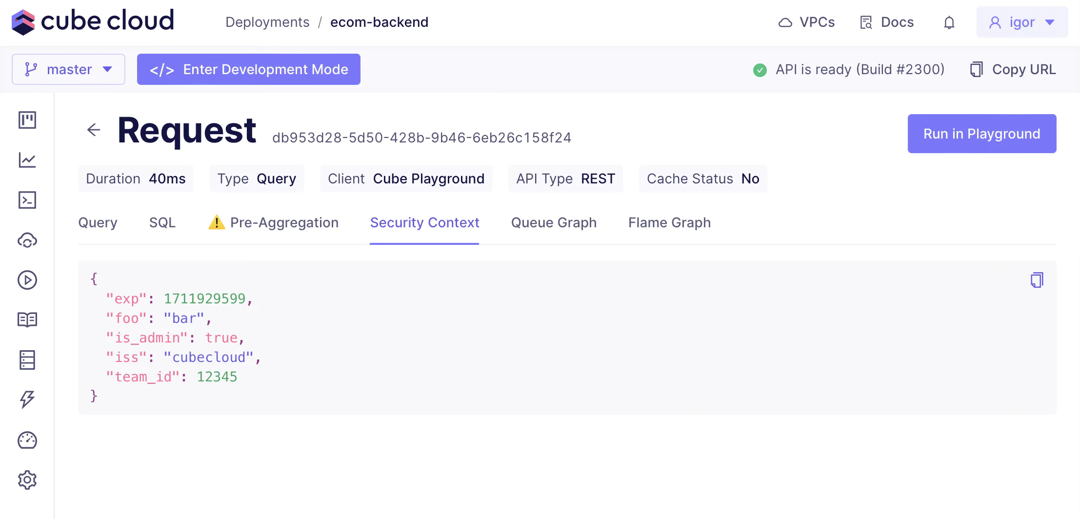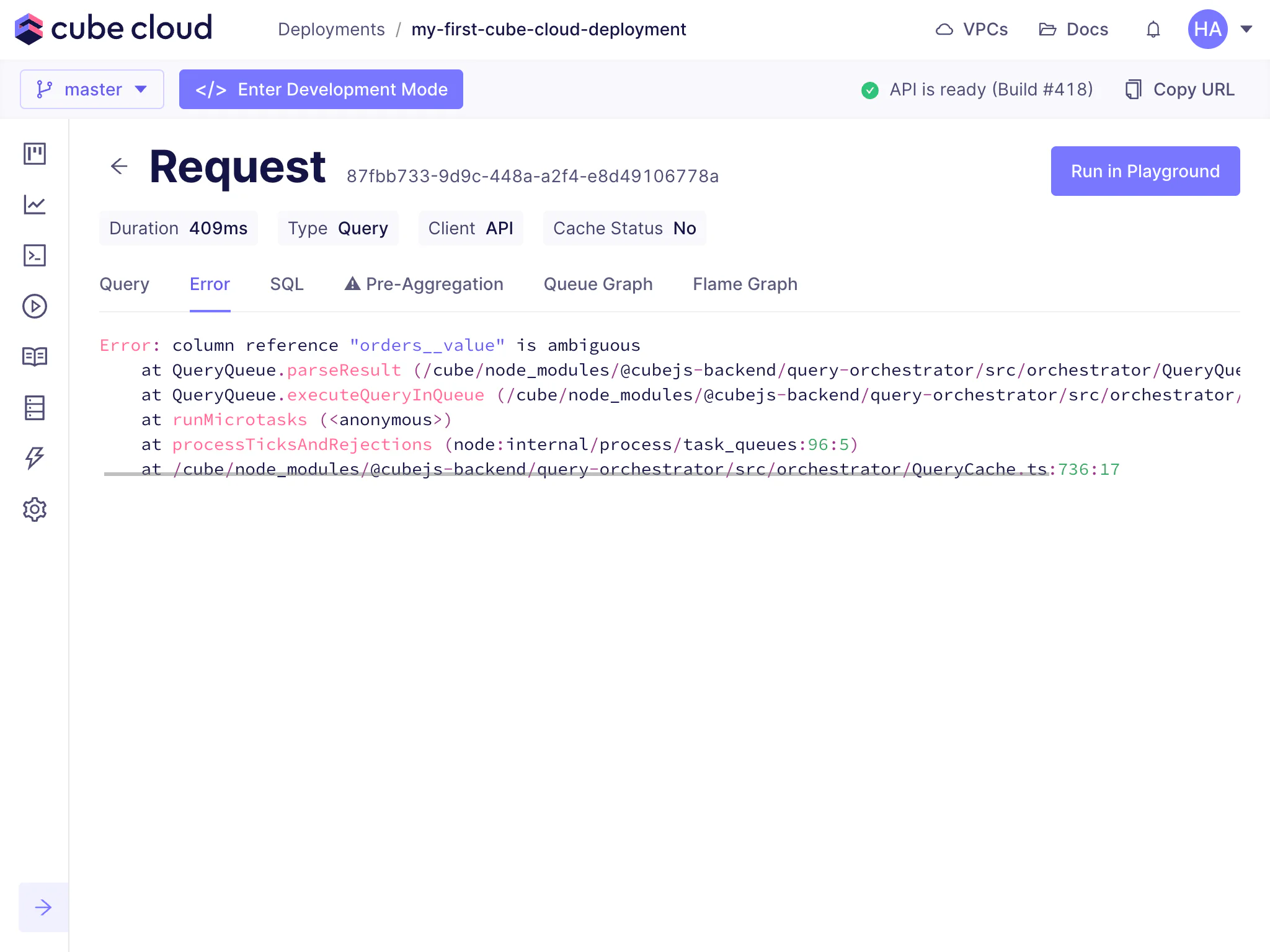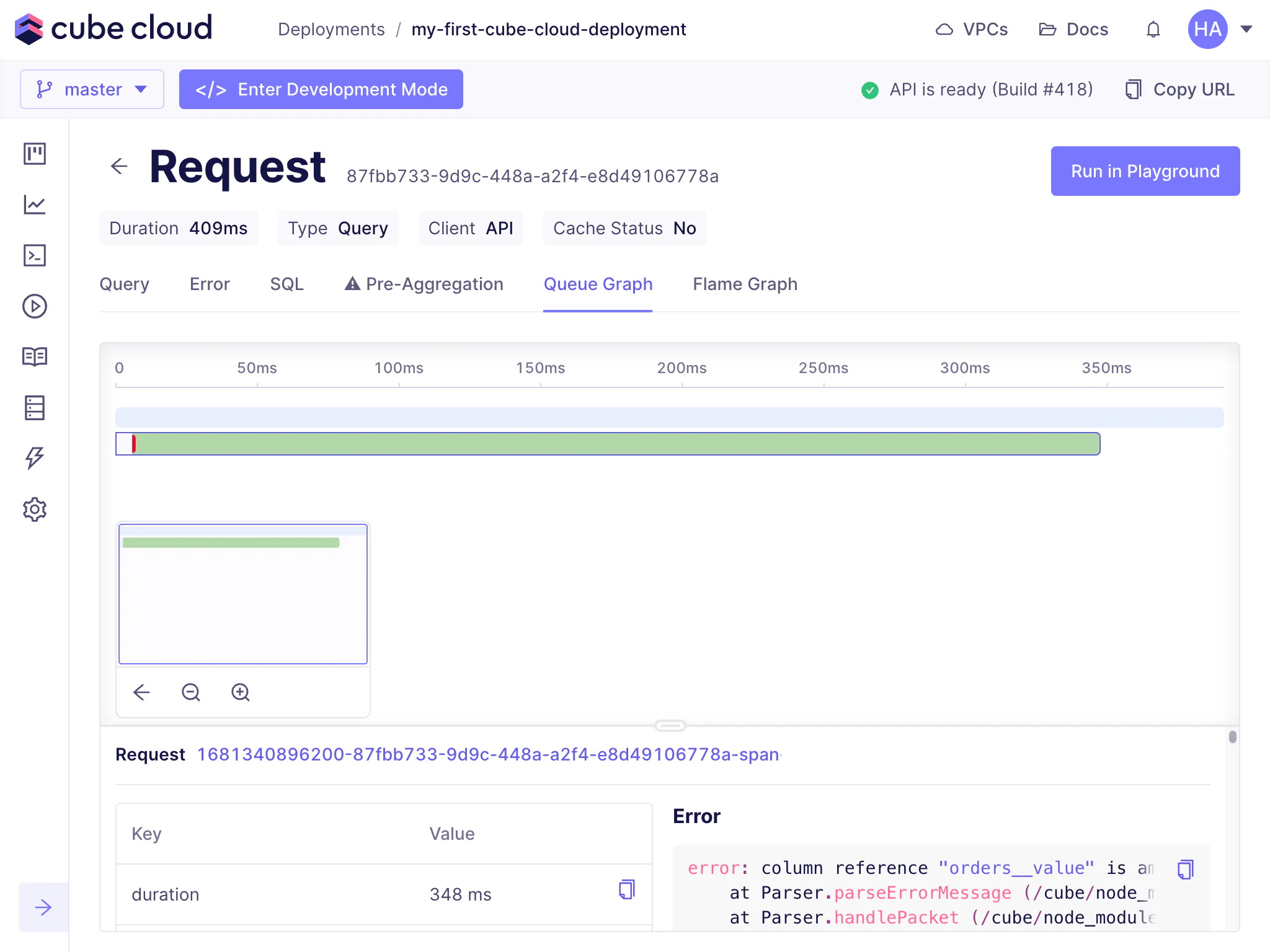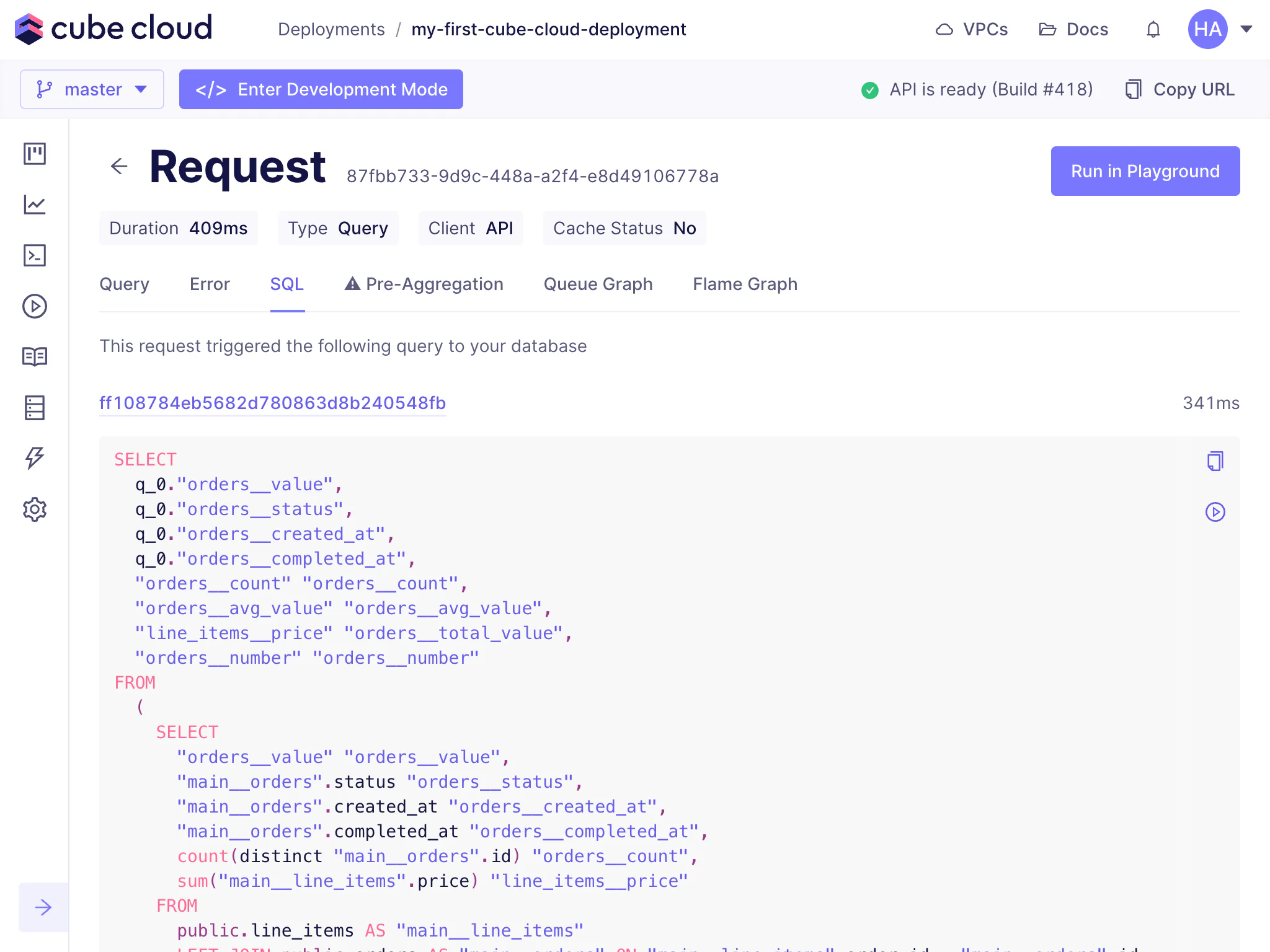 The Query History feature in Cube Cloud is a one-stop shop for all performance and diagnostic information about queries issued for a deployment.