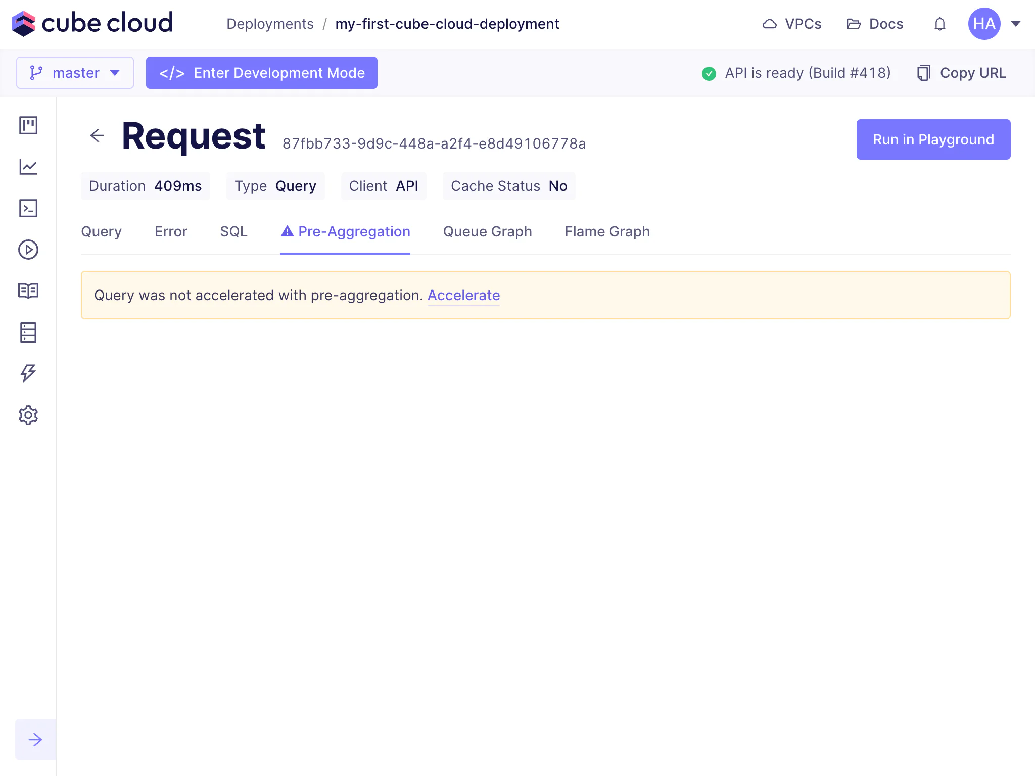 Clicking allows you to add a pre-aggregation to accelerate similar queries in the future.