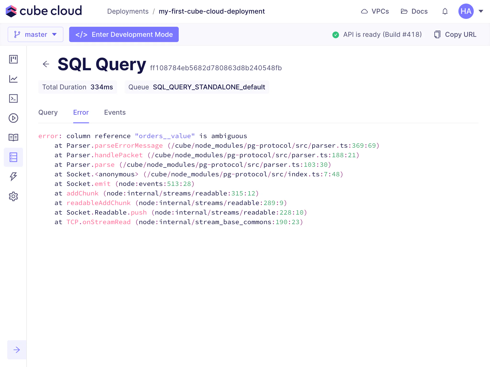If the query failed, the tab will show you the error message and stacktrace: