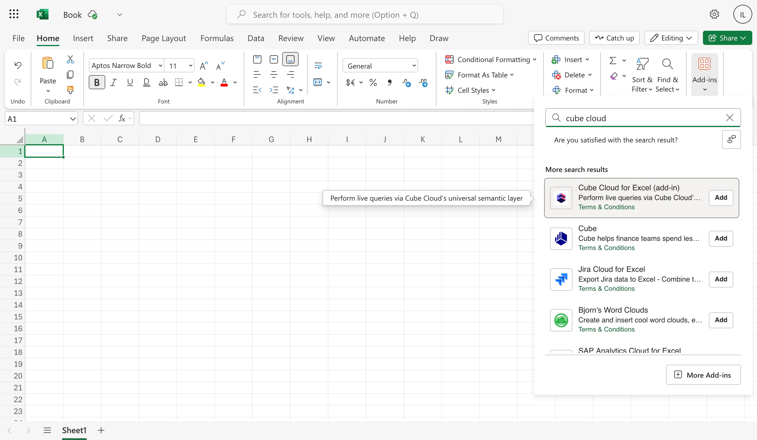 Search for Cube Cloud for Excel (add-in) and click :