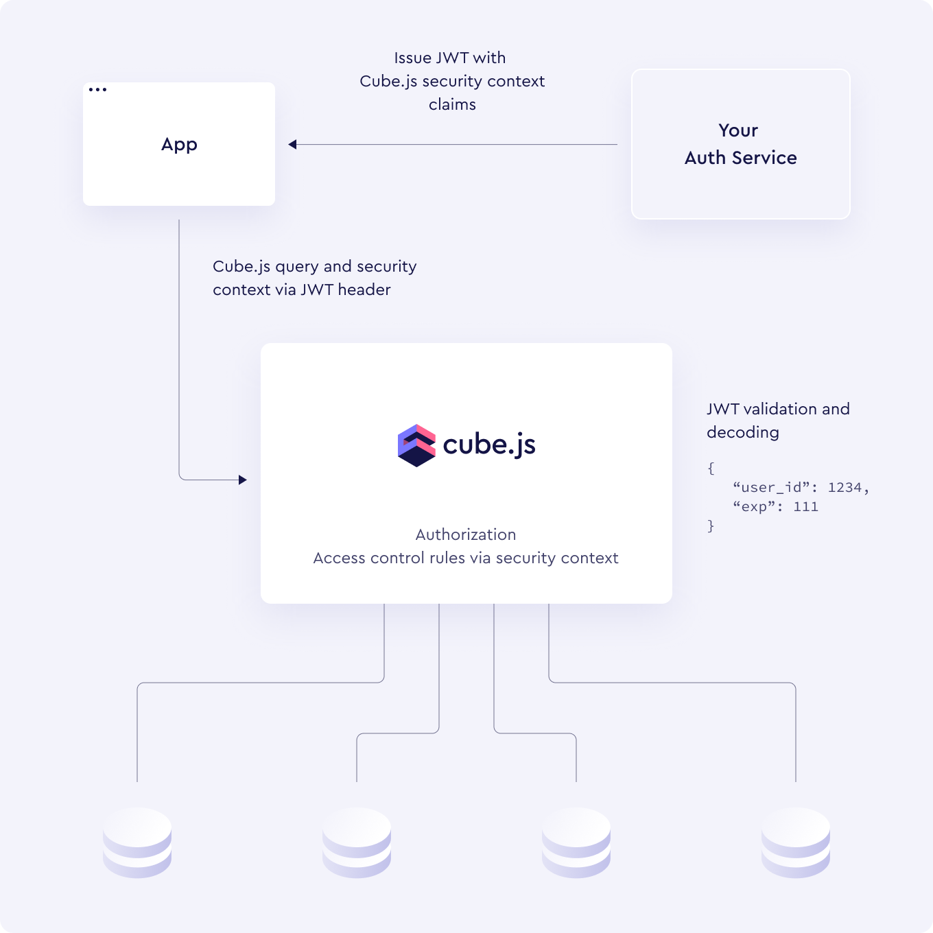 Some visualization tools (e.g., custom front-end applications) can pass access tokens based on the JSON Web Token (JWT) standard to Cube. These tokens can be either generated by these applications or obtained from an identity provider. Cube then validates these tokens.