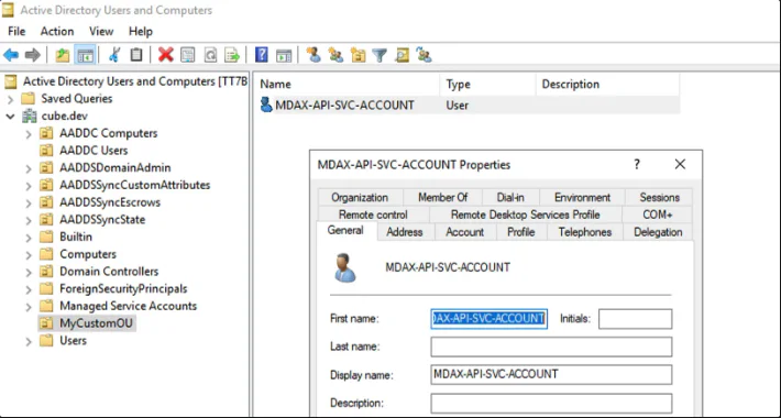 On the screenshot below, the mdax-api-svc-account user is created in the