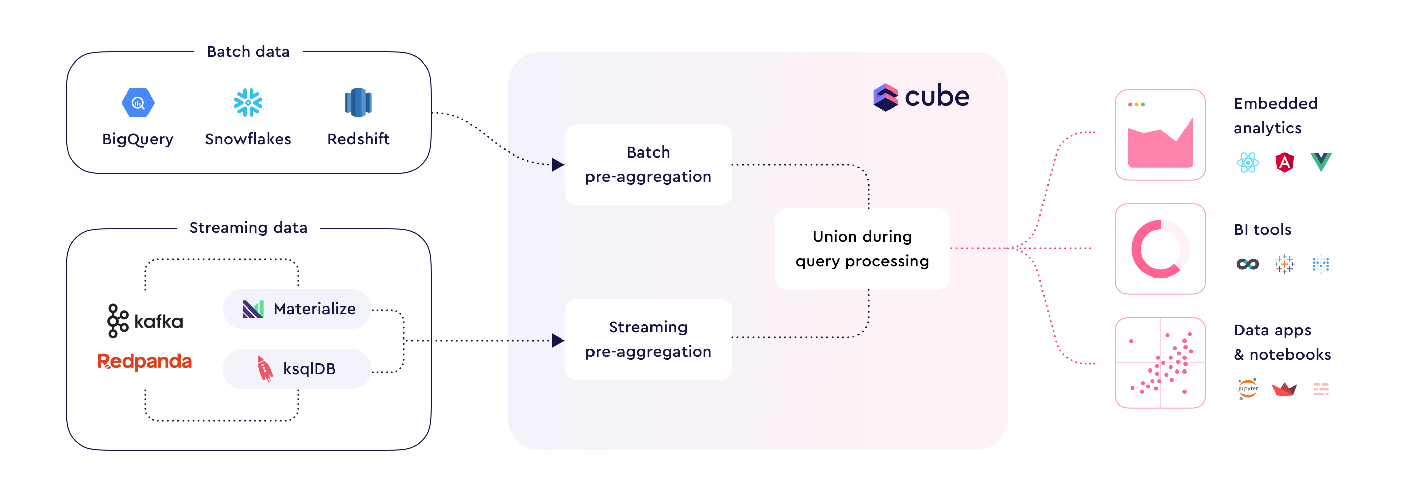 You can use lambda pre-aggregations to combine data from multiple pre-aggregations, where one pre-aggregation can have batch data and another streaming. Please note that build ranges of all rollups referenced by lambda rollup should have enough intersection between each other that anticipates partition build times for those rollups. Cube will maximize the coverage of the requested date range by partitions from different rollups. The first rollup in a list of referenced rollups that has a fully built partition for a particular date range will be used to serve this date range. The last rollup in a list will be used to cover the remaining uncovered part of a date range. Partitions of the last rollup will be used even if not completely built.