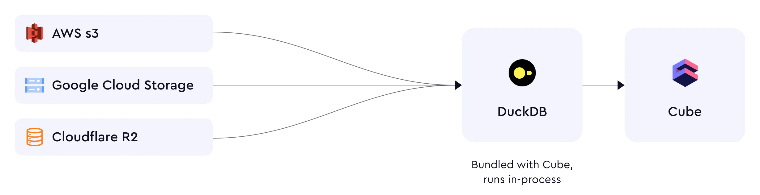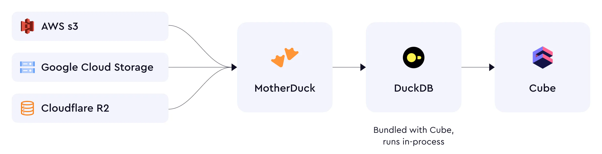 Cube can also connect to MotherDuck , a cloud-based serverless analytics platform built on DuckDB. When connected to MotherDuck, DuckDB uses hybrid execution and routes queries to S3 through MotherDuck for better performance.