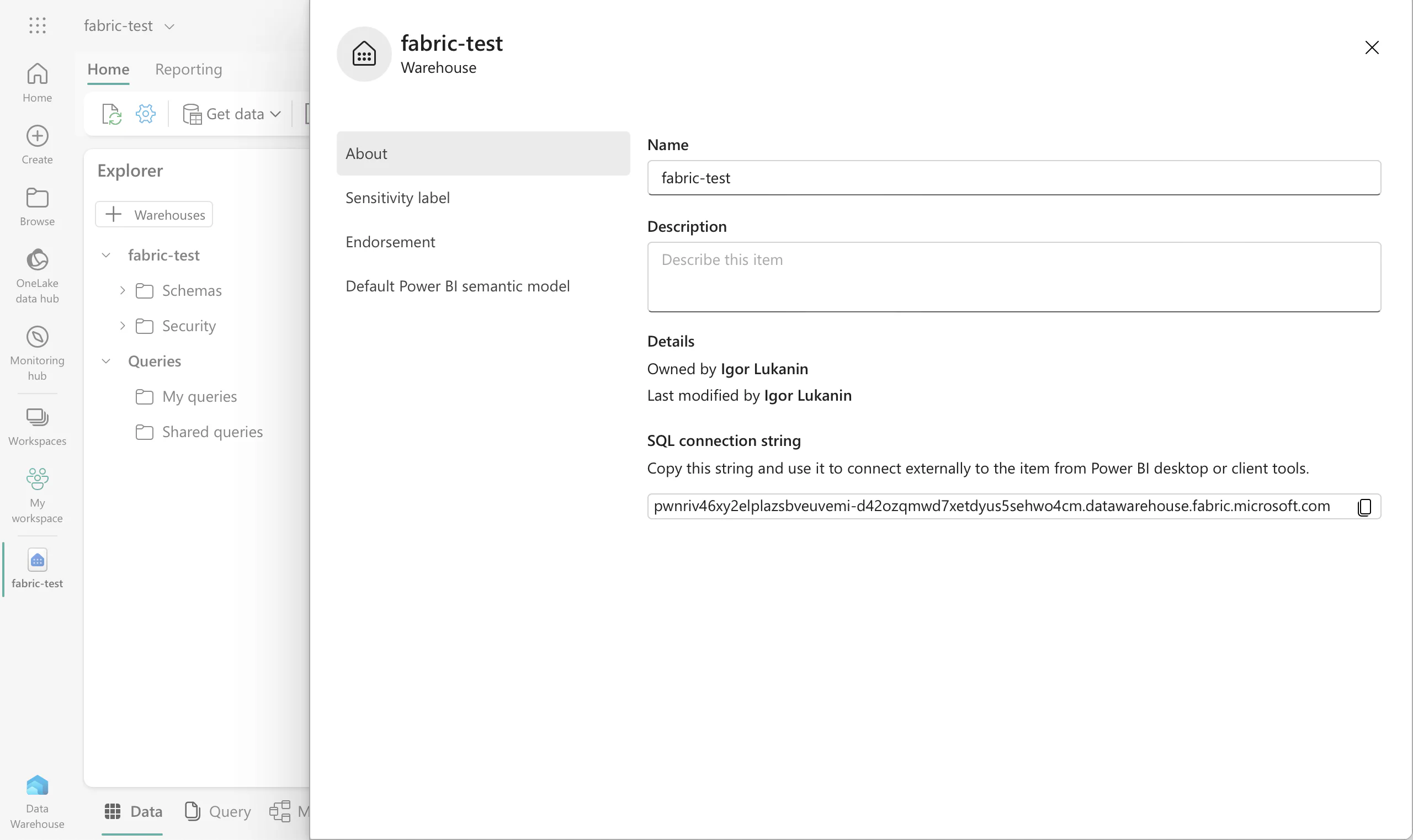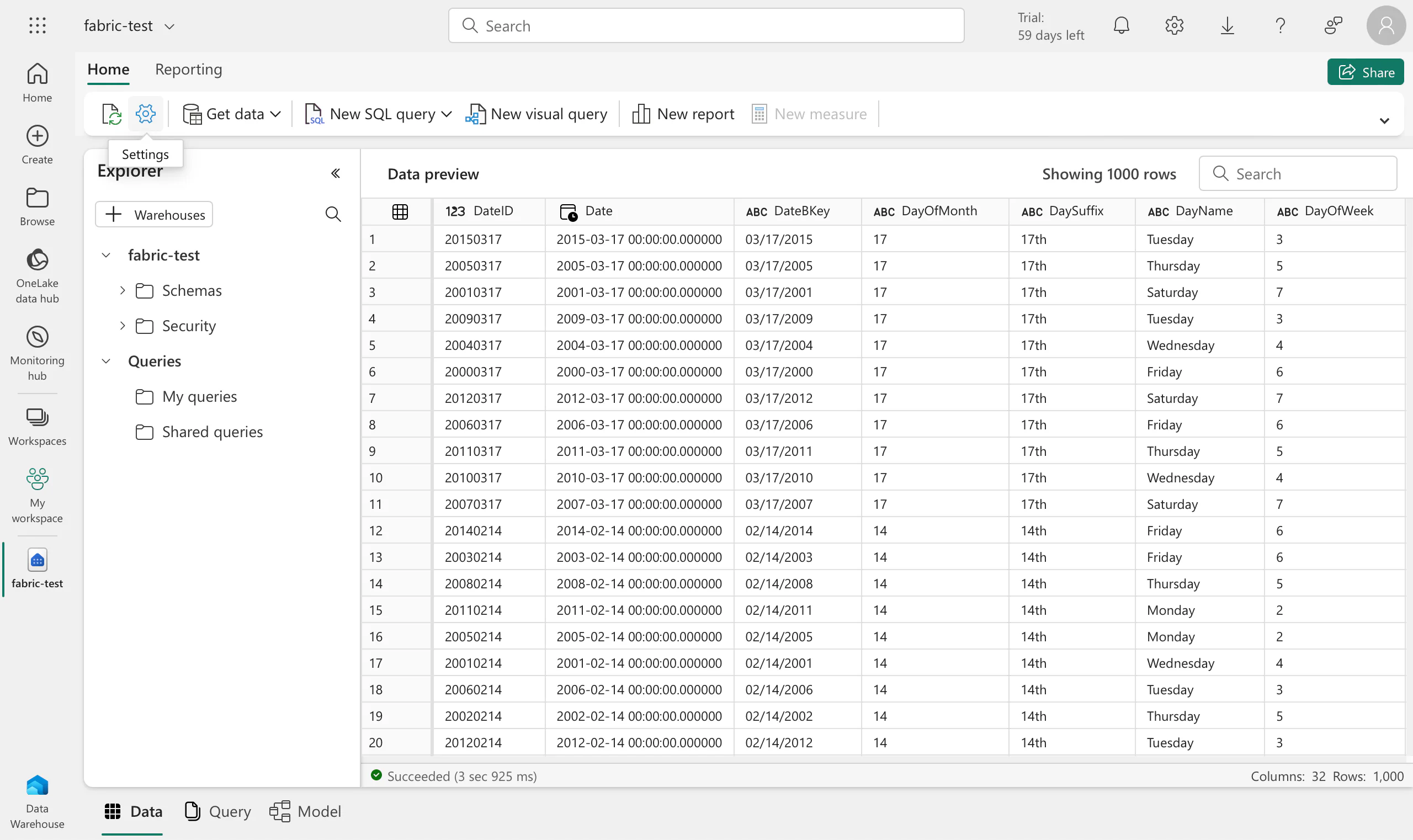 To obtain your data warehouse server name and database name, navigate to your data warehouse in Microsoft Fabric and click on the cog icon to open :