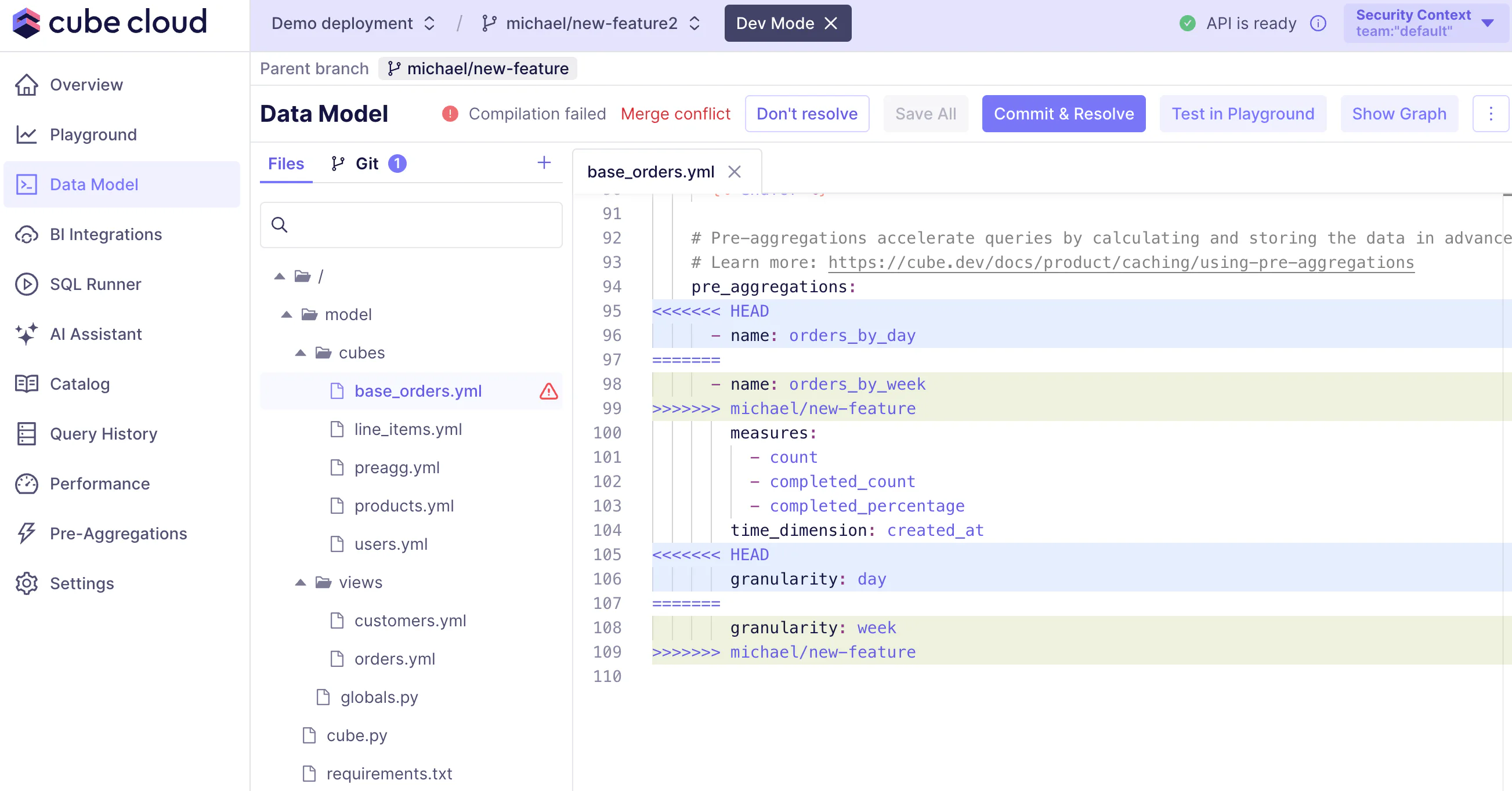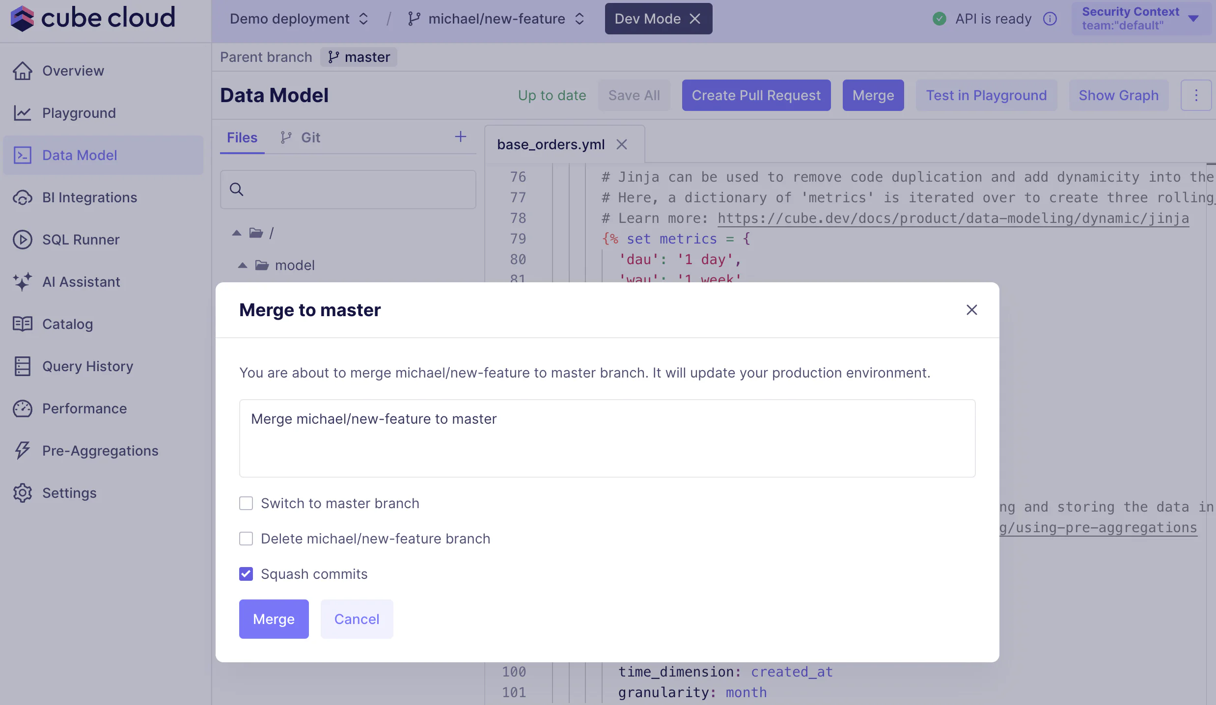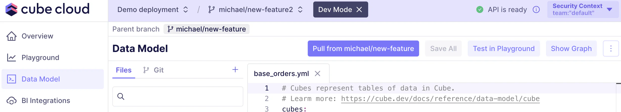 When you enter the development mode, you’ll have access to your personal API endpoints that will track the branch you’re on and will be updated automatically when you make changes to the data model.