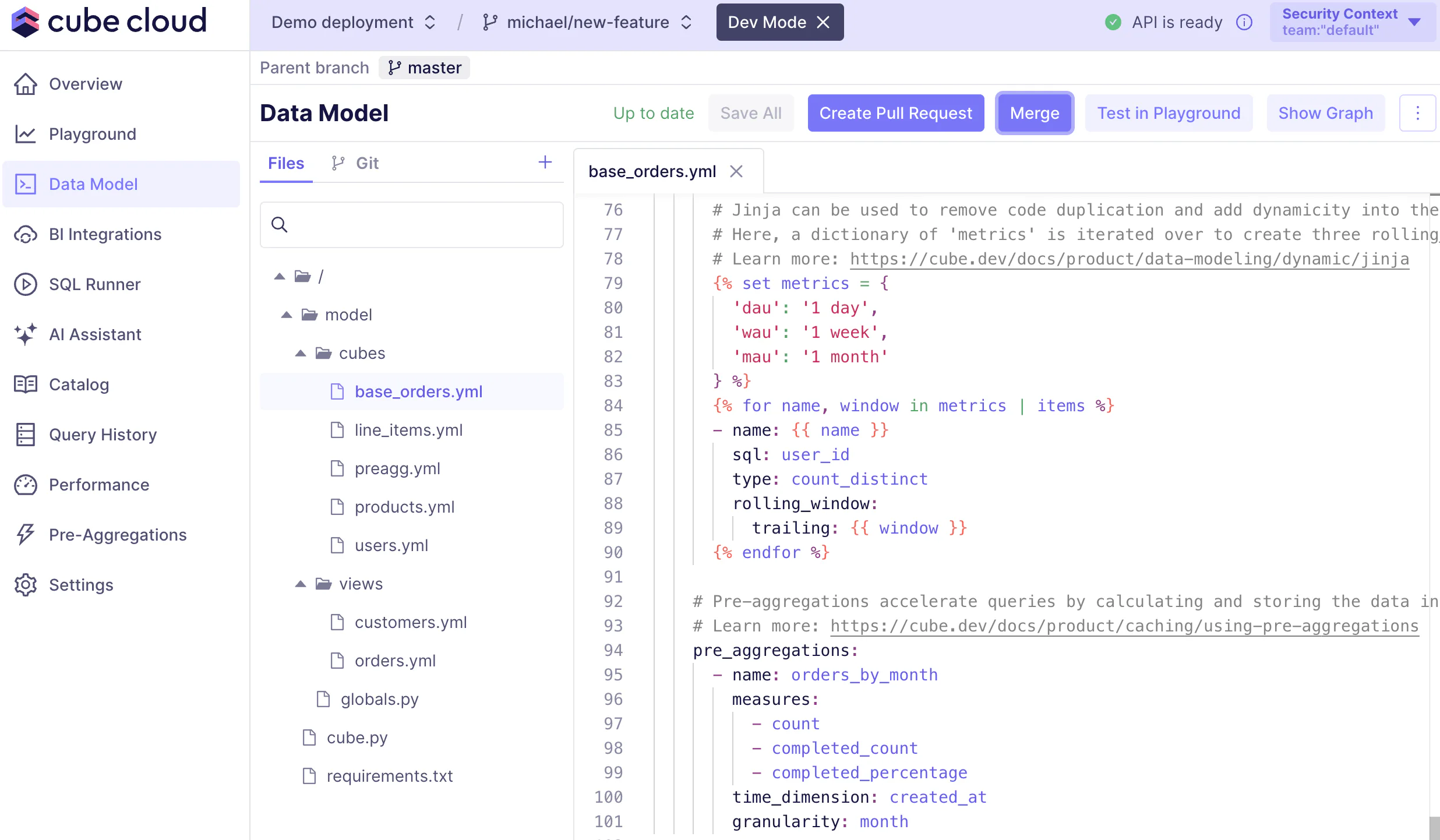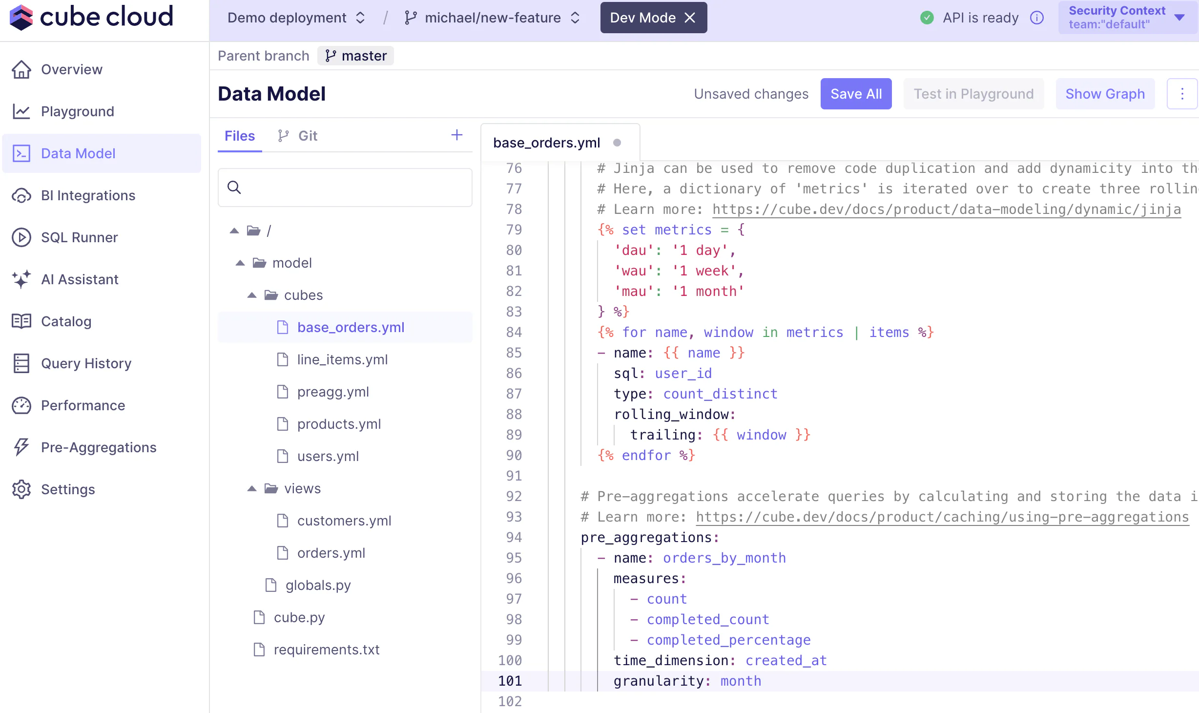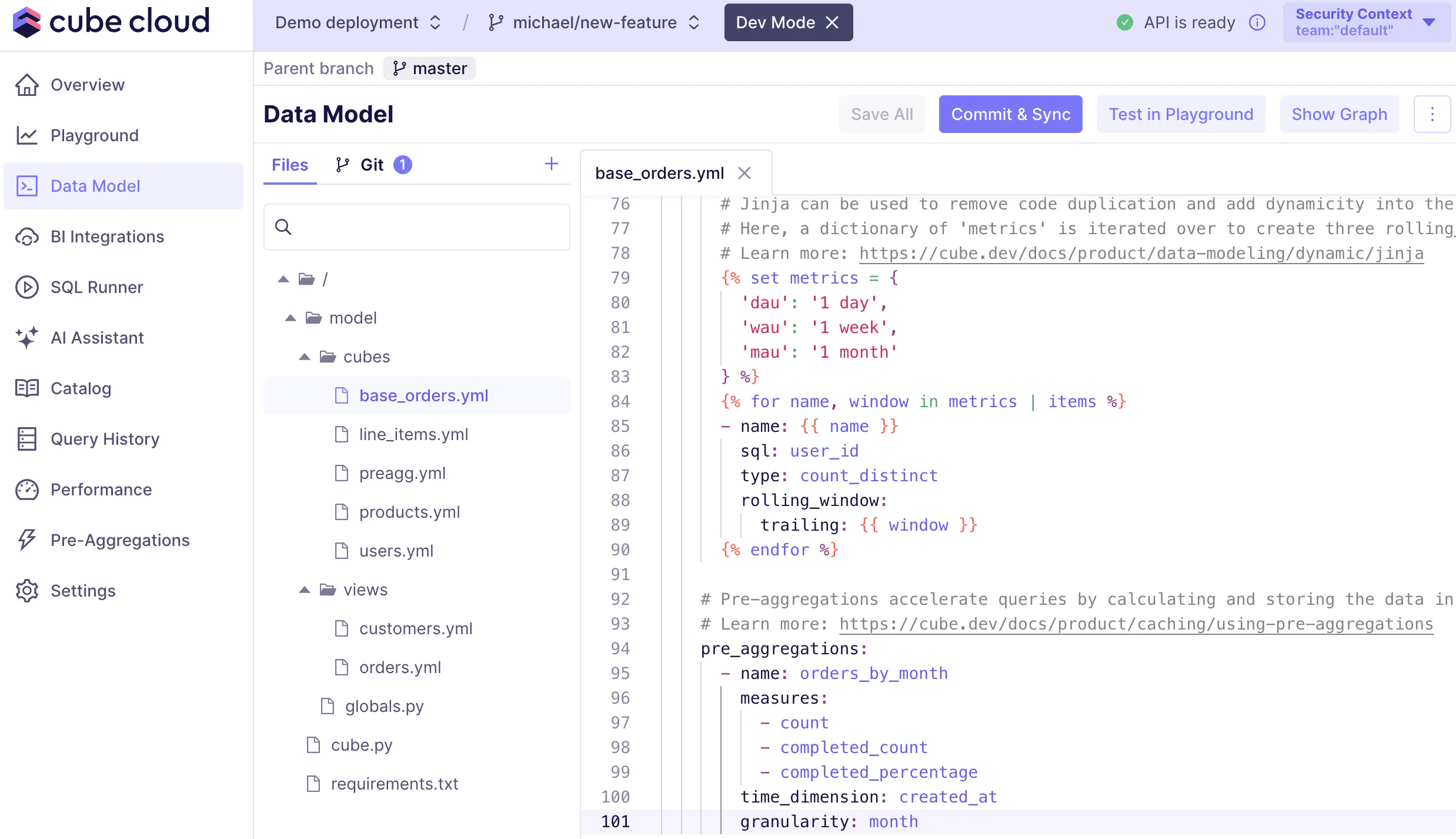 When you enter the development mode, you’ll have access to your personal API endpoints that will track the branch you’re on and will be updated automatically when you make changes to the data model.