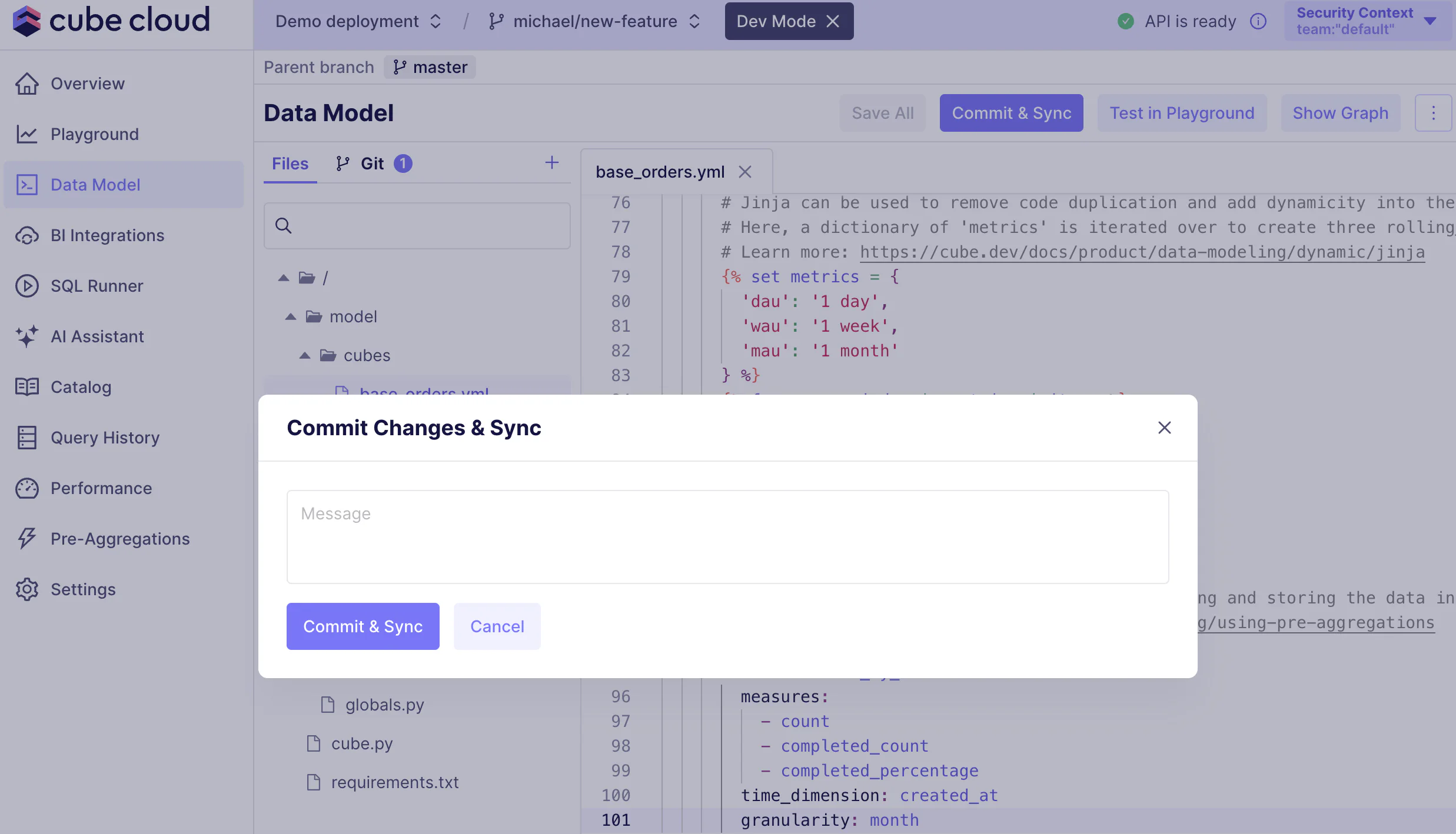 After saving changes, you can commit them to the branch you’re working on by clicking the “Commit & Sync” button in the actions bar.