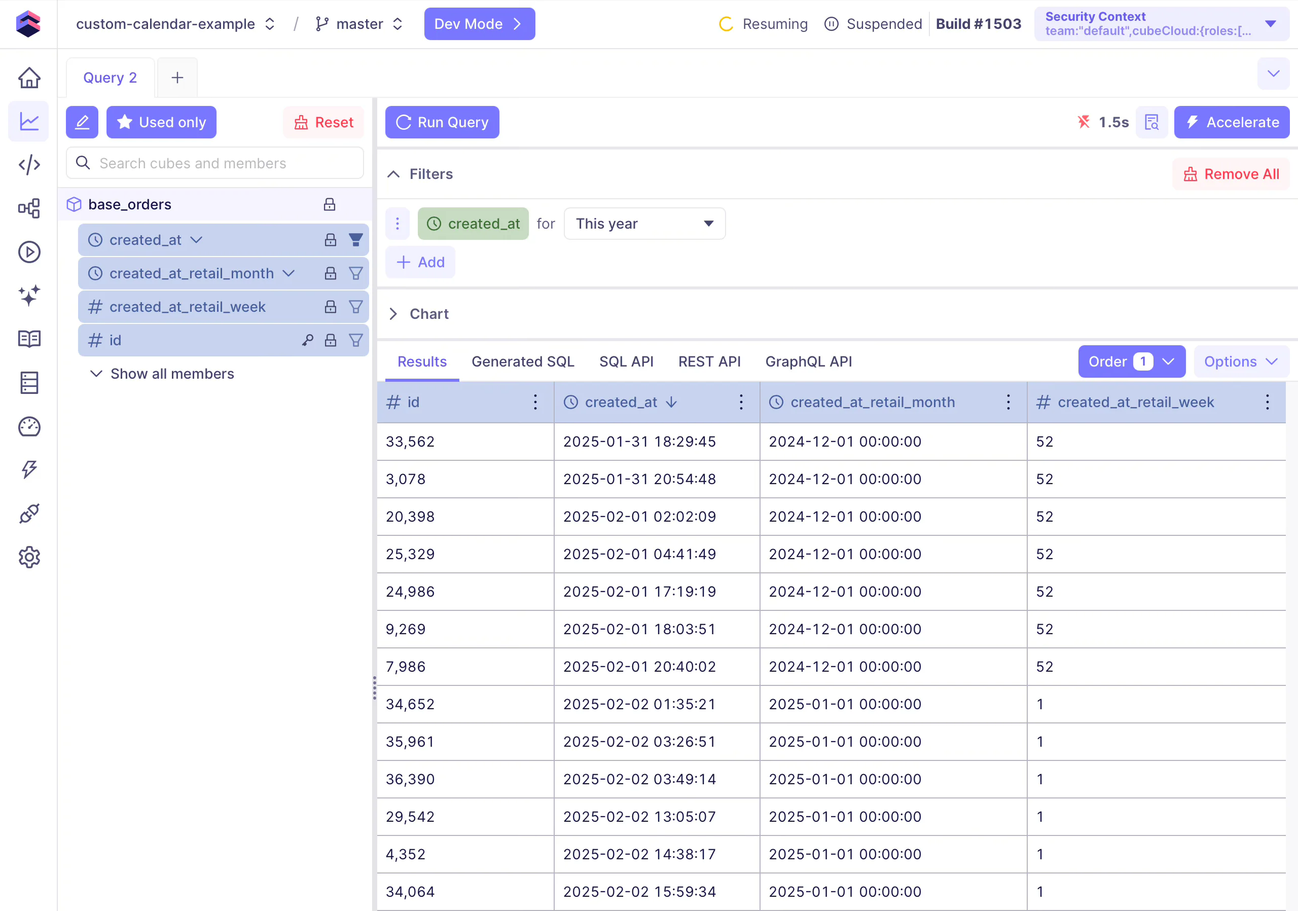 Consider the following calendar cube. It was generated using a large language model (LLM) and then tested against the official calendar . In this example, it’s generated on the fly, however, in production, it should be materialized as a table using a data transformation tool: