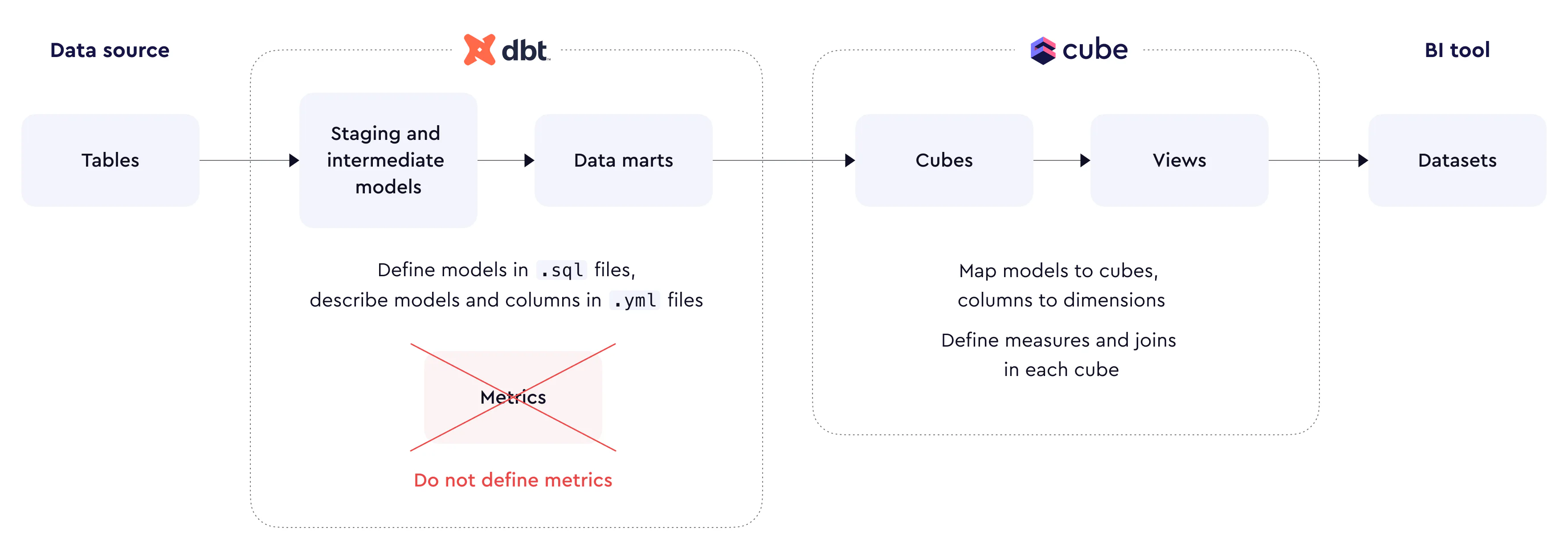 Cube projects usually define cubes on top of dbt models, materialized as tables or views in your data warehouse, bring columns as dimensions, enrich them with measures, joins, and pre-aggregations. Finally, the facade of the data model is created with views and exposed to downstream tools via a rich set of APIs.