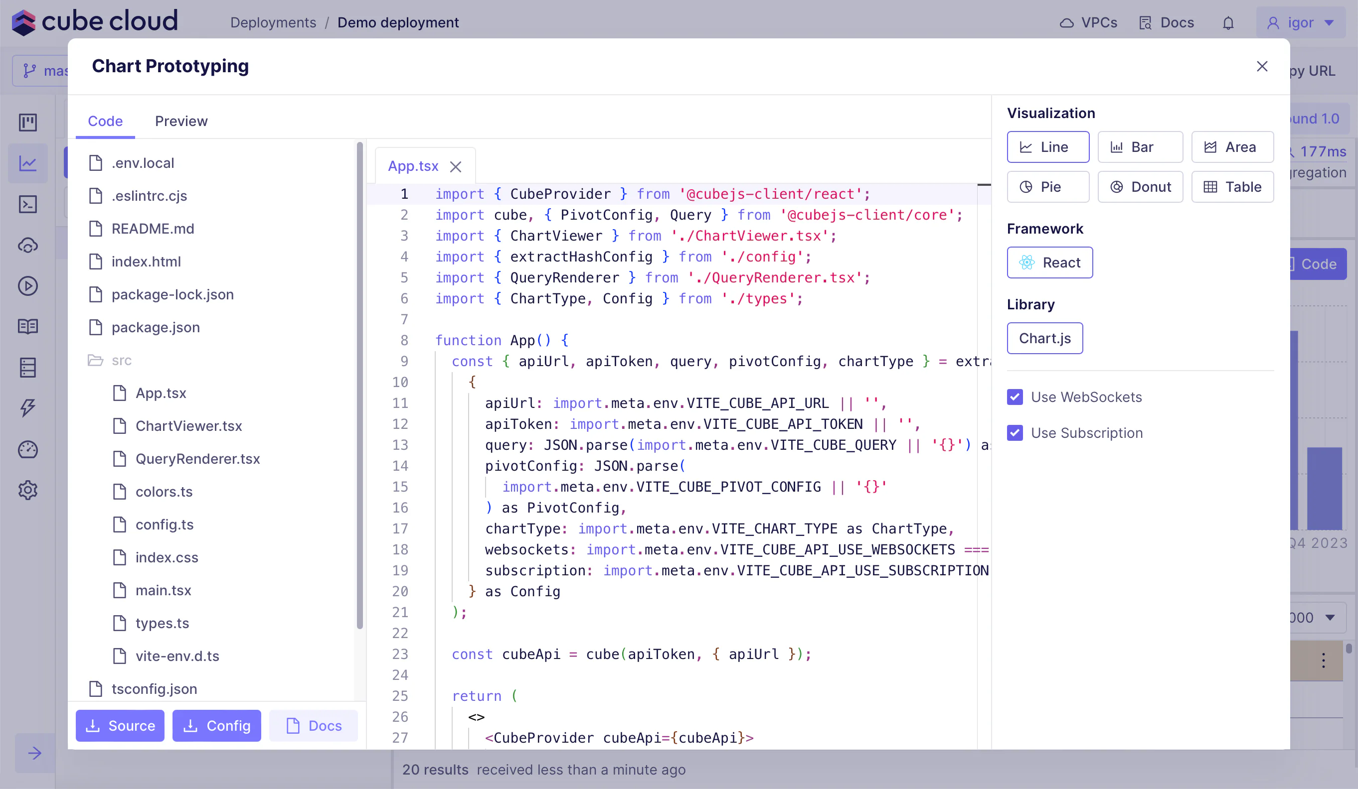 Finally, you can download a ZIP archive with the code and the file with your Cube Cloud credentials using the buttons on the bottom of the tab: