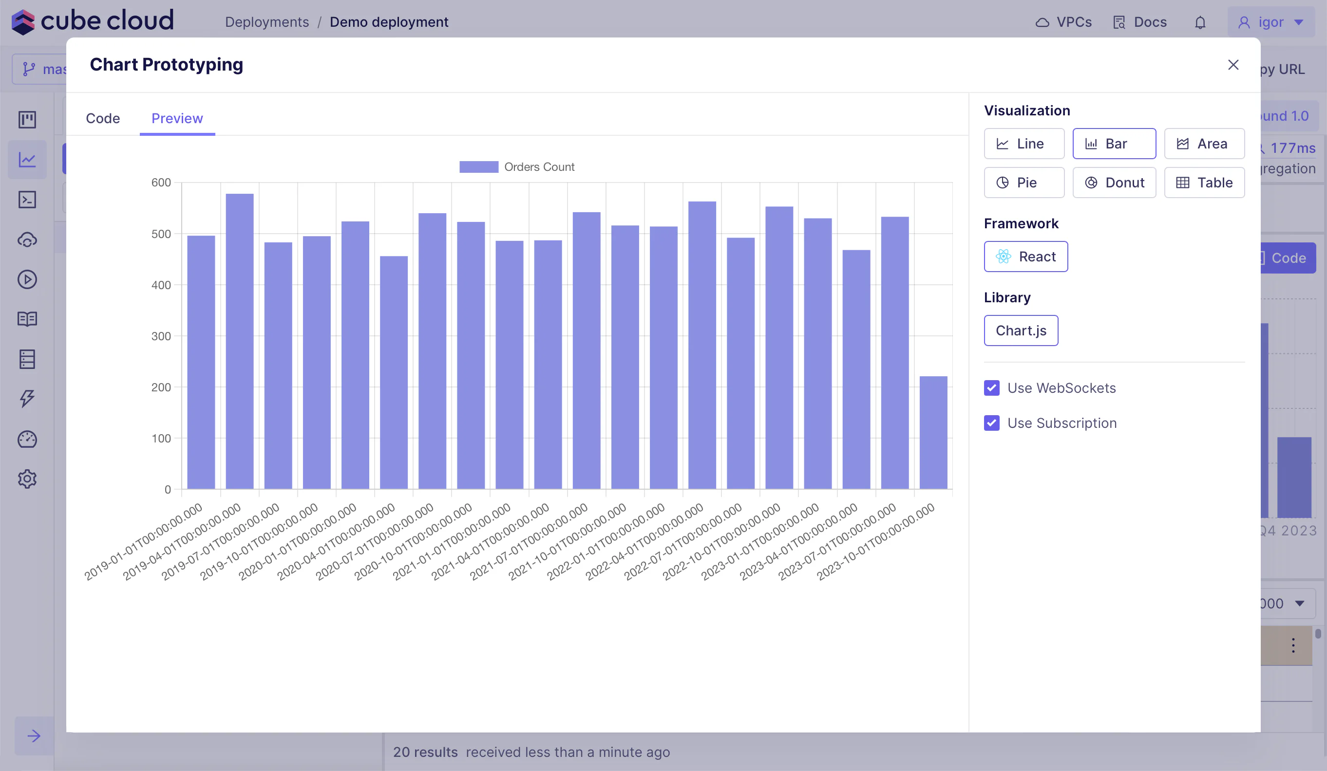 You can also customize the chart by choosing a visualization type, a framework, a charting library, or one of other options in the sidebar.